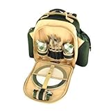 BRAM2BP1Low on price but not on quality, this green picnic backpack for 2 offers exceptional value for your money. Perfect for two people on the move. The Rambler Picnic Backpack for 2 includes 2 dinner plates, 2 extremely durable polycarbonate wine glasses, 2 sets of silverware, corkscrew/bottle opener, combination salt & pepper shaker, and 2 cotton napkins. Just add food and drink! Contents: - 2 100pct Melamine dinner plates - 2 Extremely durable polycarbonate wine glasses - 2 Knives, 2 forks and 2 teaspoons - Corkscrew/bottle opener - Combination salt & pepper shaker - 2 Cotton napkins Features: - Service for 2 people - Luxury suede leather trim - Removable and washable leak-proof liner for food compartment - Superior stainless steel cutlery Specifications: - Backpack materials: canvas - Color: green