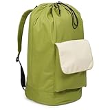 Laundry carry pack, holds up to 2 large loads, features adjustable padded carry straps for convenient mobility, back zipper for easy loading and unloading. Bonus quarter dispenser included for convenience, khaki with green accents.