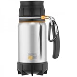The 16-ounce leak-proof travel mug by Thermos is designed to go anywhere and to enhance the experience of being there. The Thermax vacuum insulation virtually eliminates temperature change by creating an airless vacuum space between two stainless-steel walls. The result is an insulation layer designed to keep food and beverages hotter, colder, fresher, longer. Made with an unbreakable 18/8 stainless-steel interior and exterior, the mug will stand up to heavy use. Its leak-proof 360-degree drink lid is easy to use and drinkable from any direction. An integrated stainless-steel carry loop with carabiner offers a space-saving and instantly accessible attachment to backpacks and other gear. A rubberized shock-absorbing base with wide stance provides stable footing. All in all, this is a versatile and durable travel companion.
